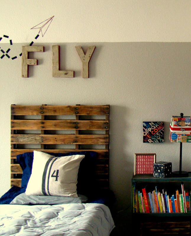 Una buena idea para dar un toque de color a los cabeceros de la cama es usar palets restaurados y decorados. Utiliza palets que estén en buen estado, lija la superficie con una lijadora manual y después aplica varias capas de pintura de algún color que combine con el resto de tu estancia.