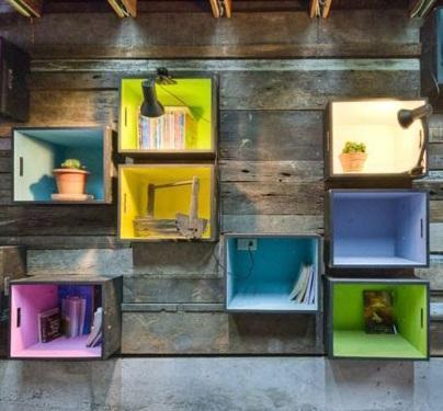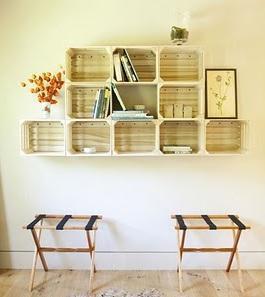 Esta repisa impresionante y hermosa al mejor estilo de cualquier tienda de decoración fue hecha también con cajas de frutas de madera, si prefieres puedes elegir las de vino. Debes lijarlas e instalarlas como prefieras, si lo deseas puedes pintarlas como ves el resultado es impresionante. También puedes ver aquí cómo restaurar una caja de vinos y convertirla en una mesita auxiliar.