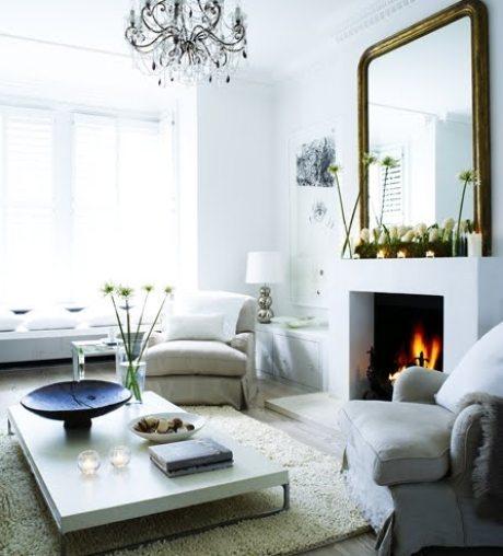 Este salón que te proponemos es la clara imagen de mezcla de estilos: una chimenea que podríamos calificar de tradicional porque está encastrada y su fuego se hace con la quema de leña, convive en un salón de tonos blancos, con líneas rectas, con elementos modernos como el espejo o la lámpara, de tal manera que este espacio se convierte en un salón actual sin perder el calor de hogar.Si eliges adecuadamente los elementos de distintos estilos, podrás conseguir un espacio único y acogedor, para recibir tus visitas y amigos en este maravilloso salón con chimenea.