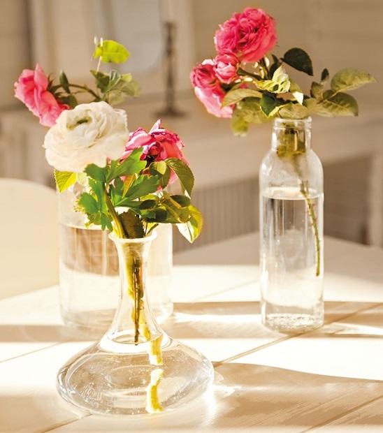 La posibilidades de elementos decorativos para salones en verano son infinitas, pero siempre acaban triunfando las velas aromáticas blancas y otras que sean del mismo color que los textiles o jarrones y botellas de vidrio transparente con flores o frutas naturales para llenar de vida y color la estancia.