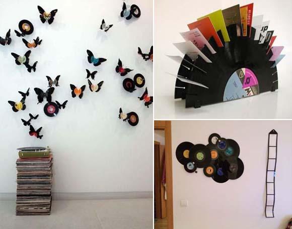¿Tienes vinilos por casa que no escuches o que estén deteriorados? Te proponemos una solución muy divertida. Primero quita bien el polvo y si tienen zonas decoloradas, pinta de negro. Una vez se seque, podrás crear una composición en la pared pegando y superponiendo unos discos con otros. También puedes recortar los vinilos y crear algunas formas con ellos para crear un mural de formas de la naturaleza que contraste con lo artificial del material. En la imagen, podrás ver lo bonito que quedan unas mariposas creadas con discos y pegadas sobre una pared blanca.