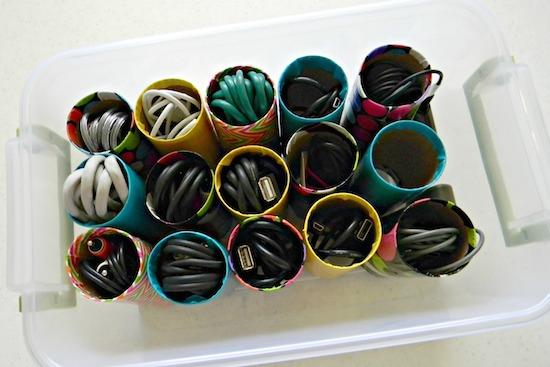 En aquellos casos en los que los cables no están sueltos, sino que más bien se encuentran enrollados porque no necesitamos toda su longitud al estar el dispositivo y el enchufe muy cerca, podemos optar por introducir el cable entero en botellas transparentas. Esta es quizás una de las opciones más extrañas y arriesgadas, pero también es sin duda una de las formas que aportarán personalidad al hogar. Un buen consejo a la hora de guardar cables que no utilicemos es enrollarlos e introducirlos en el interior de un rollo de papel higiénico terminado. De esta forma podremos evitar que los cables se enreden, además de poder ordenarlos en el caso de que debamos utilizarlos. Asimismo, aprovechando la idea de los rollos de papel, puedes decorarlos pintándolos de la forma que más te guste e introducir los cables dentro, formando una cadena de rollos alrededor. De hecho, es una buena forma de que los más pequeños de la casa contribuyan a la decoración del hogar y se diviertan.Otro consejo útil a la hora de guardar cables de dimensiones más pequeñas, como auriculares, es enrollarlos utilizando una pinza de tender la ropa, de tal forma que se enrolle por la parte superior y posterior, y finalmente pinzar los auriculares.