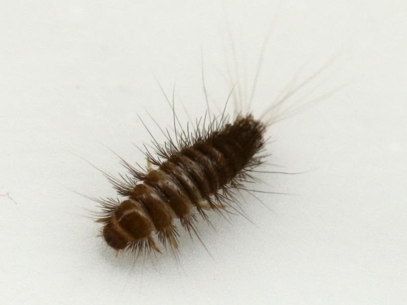 - Las larvas son tipo gusanos con pelos, que son urticantes. En la imagen de abajo puedes ver una larva de escarabajo de la alfombra.