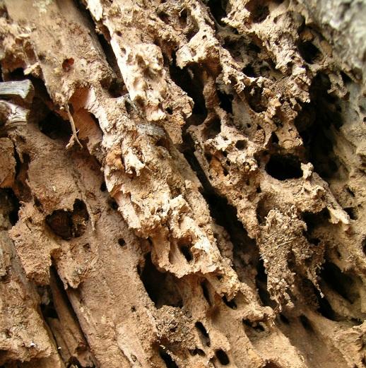 - Termitas de madera: estas sí son visible y dejan huella en forma de serrín, agujeros en la madera, rastros, un enjambre alrededor de las aberturas en madera infestada, especialmente después de la lluvia, etc.