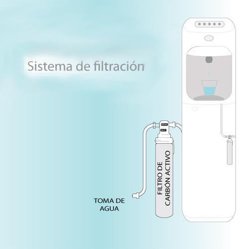 El proceso del filtro de agua es muy sencillo: las partículas sólidas que se encuentran en el agua se separan mediante un medio filtrante, o filtro en este caso carbón activo, que permite el paso del fluido a su través, pero retiene las partículas sólidas.