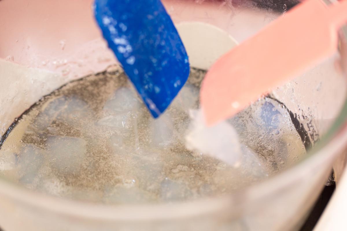 El primer paso para hacer jabón potásico consiste en mezclar el hidróxido de potasio con el agua en un recipiente no metálico e ir removiendo con una cuchara de madera. Esa sencilla mezcla provocará una primera reacción y notarás que su temperatura aumenta ligeramente. En otro recipiente, calienta, al fuego o al baño María, el aceite vegetal de manera que quede templado (sin hervir).