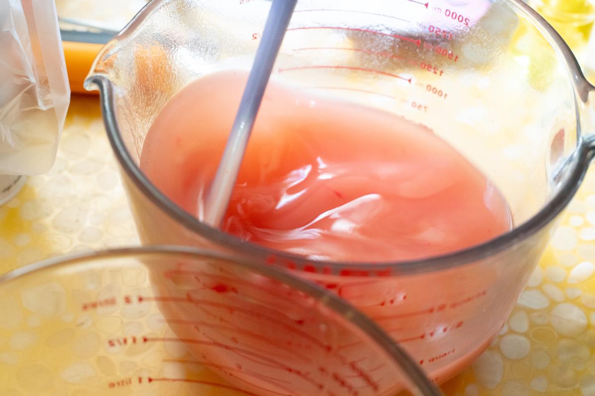 El siguiente paso consiste en unir la mezcla de hidróxido de potasio disuelto en agua con el aceite que habías calentado, para que la grasa, en contacto con el agua, inicie la saponificación, es decir, el proceso químico que hace que esa grasa y el agua se fundan en una única sustancia nueva que es, en definitiva, el jabón. Para mezclar la solución de hidróxido potásico y agua con el aceite vegetal es esencial que ambos preparados estén a temperatura ambiente.