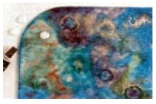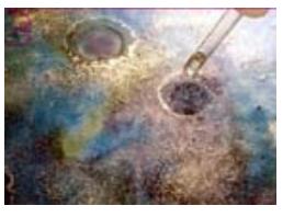 Cuando la pintura aún no ha secado, pero esta ligeramente oreada, produce algunos manchones o aureolas, aplicando pigmentos en polvo en fina lluvia o echar algunas gotas de thinner con un gotero o la punta de un pincel. Deja secar la pieza en plano, sin moverla, al menos 24 hs.