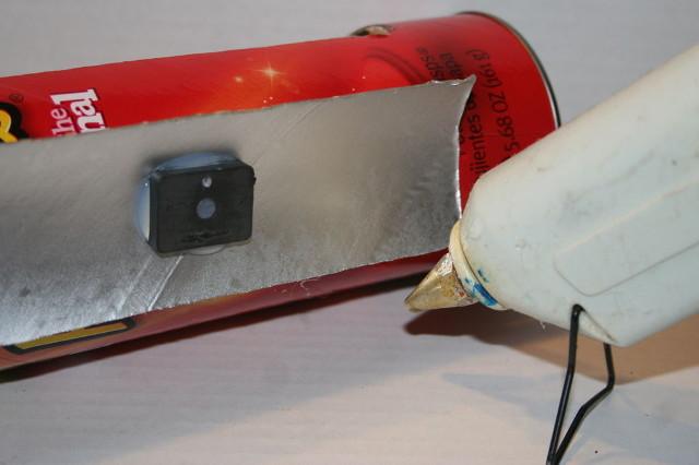 Toma el rectángulo y vierte pegamento caliente a lo largo del centro de la pieza. Pega la pieza en el horno. Trata de asegurarte de que cuando dejas el horno solar, se puede orientar hacia el sol directamente.