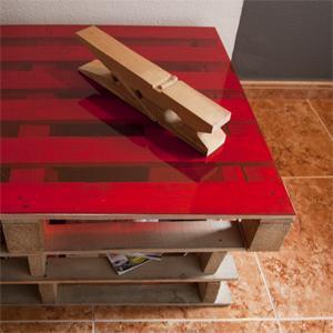 Para la parte superior puedes comprar una plancha de cristal o metacrilato de la medida exacta de los palets. Te aconsejo el metacrilato porque no se rompe ni es cortante, aunque deberás ser cuidadoso para que no se ralle.