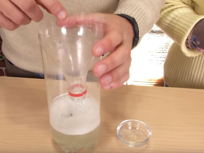- Ahora, coloca el cuello cortado de la botella boca abajo e introdúcelo en la botella, en forma de embudo, como hemos hecho en el apartado anterior.