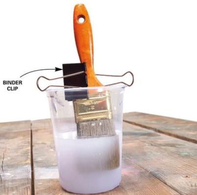Después de sumergirla en el disolvente, vuelve a recuperar un papel absorbente o estropajo, para volver a retirar el excedente, tanto de pintura y suciedad, como del propio solvente. A continuación, enjuaga la brocha bajo un chorro de agua. Gracias a la fricción de tus manos y la presión del agua, las cerdas de la brocha acabarán de eliminar los restos de pintura. Para evitar que los pelos de la brocha se estropeen debes aguantar el pincel o brocha para que esta no toque el fondo del vaso, como puedes ver en la imagen, aquí ves un consejo para que se mantenga suspendido.