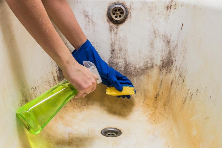 - Con la ayuda de una esponja, un cepillo o un paño con microfibras, frota las zonas de la bañera rociadas anteriormente.
