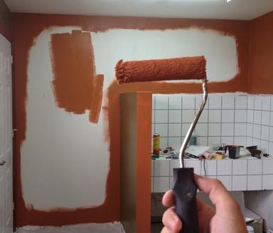 Una vez ya está equipado correctamente deberás empezar a preparar la pared, primero pasa un papel de cocina por encima de la pared para evitar que haya cualquier gota u humedad. Primero pintaremos la pared con el color principal, no te preocupes si no queda bien, cuando pintemos con el segundo color ya lo arreglaremos.