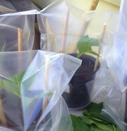 Después de 3 semanas los esquejes deben tener raíces y están listos para quitar el plástico. Saca la bolsa y dejalos al sol en el exterior.