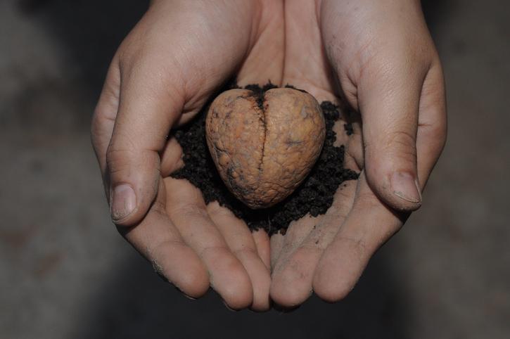 - Retira los palillos del hueso del aguacate y plántalo en el centro de la maceta; asegúrate de dejar parte del hueso fuera de la tierra igual que hemos hecho anteriormente con el agua, principalmente para no dañar la planta que habrá salido en la parte superior del hueso.