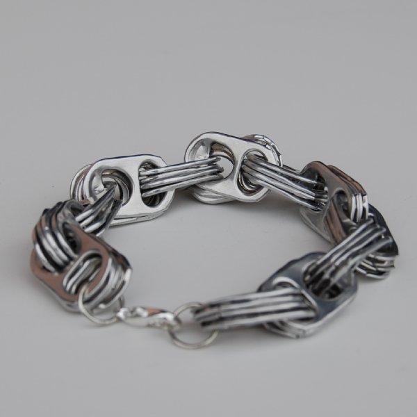 Si has coleccionado varias anillas de las latas de refresco puedes unirlas mediante un alambre, hilo o lana y hacerte una pulsera o brazalete o un collar. Recuerda comprar un alambre que no se oxide, así evitarás reacciones alérgicas e irritación.