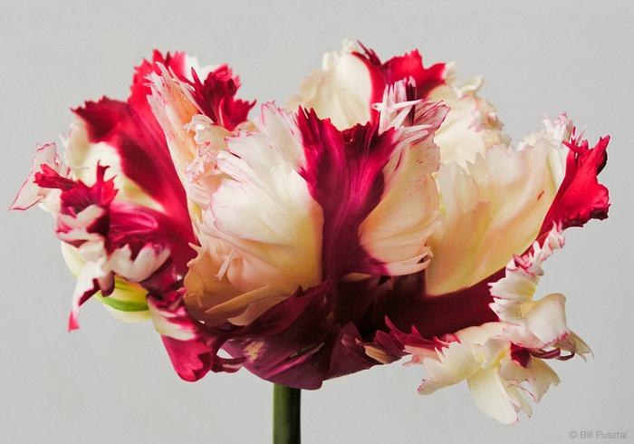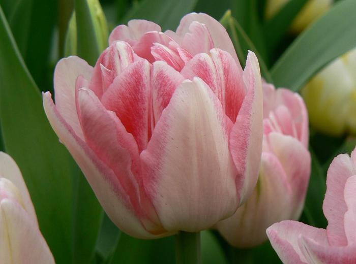 Esta variedad de tulipán produce una flor redonda con pétalos rizados, jaspeados de blanco y rojo.
