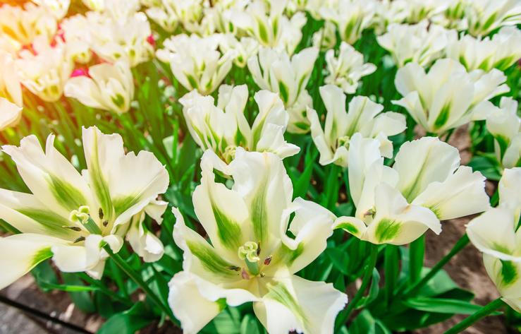 Esta variedad de tulipa tiene pétalos en forma de pluma de color blanco con listas verdes, llaman mucho la atención por no ser de los más comunes.