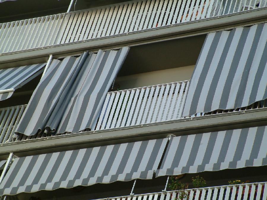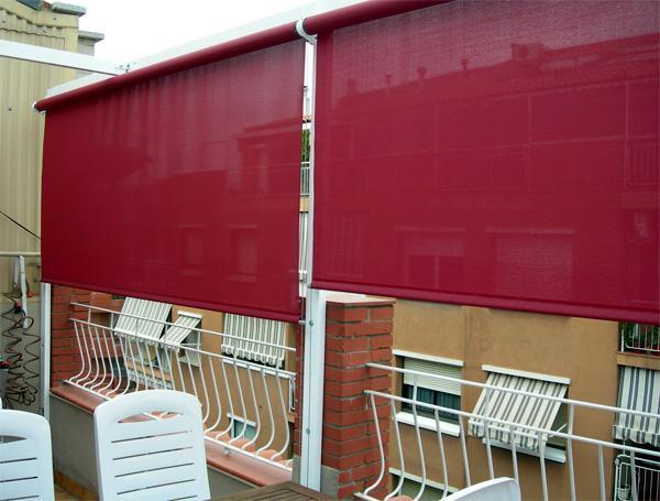 Toldo verticalEste tipo de toldo también recibe el nombre de estor o "screen". Se desenrolla en sentido vertical y se sujeta a la barandilla de la terraza o balaustrada por medio de un pasador. Se puede separar hasta 50 centímetros del balcón al abrir el brazo que lleva acoplado.