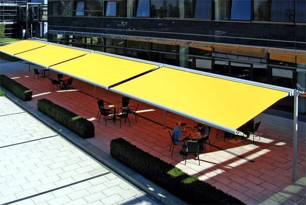 Toldo planoEstá indicado para cubrir patios, grandes terrazas o lucernarios, entre otros. Se coloca en posición horizontal, o con una mínima pendiente, y se sujeta mediante una estructura cuadrada o rectangular, igual al perímetro del área que se debe cubrir, soportada por patas o bien mediante el anclaje entre patas y pared.