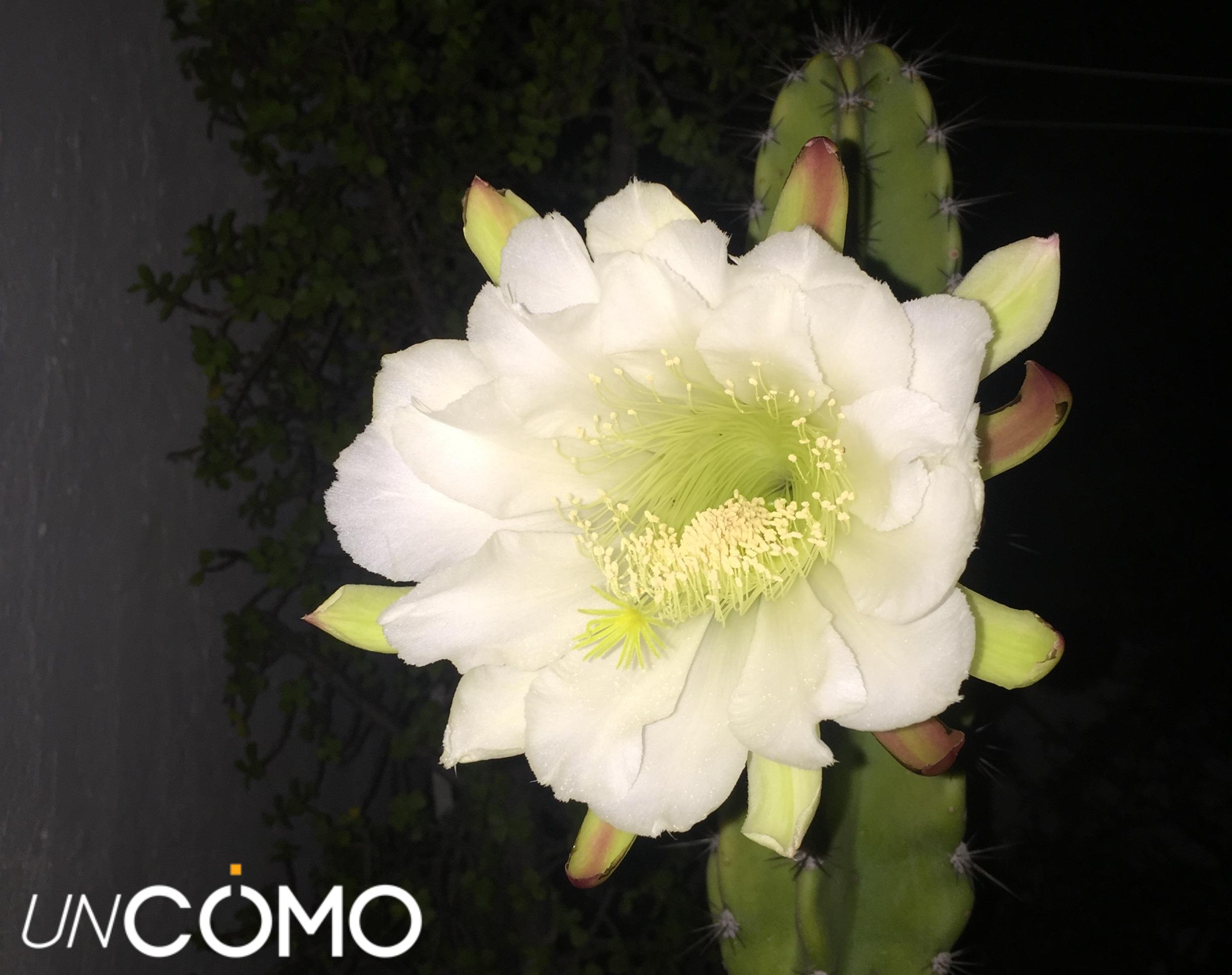 - Las flores son de color blanco y nacen siempre en la zona alta del tallo. Además, suelen abrirse por la noche y desprenden un fuerte aroma. En la imagen de abajo puedes ver una de estas grandes flores blancas abriéndose de noche.