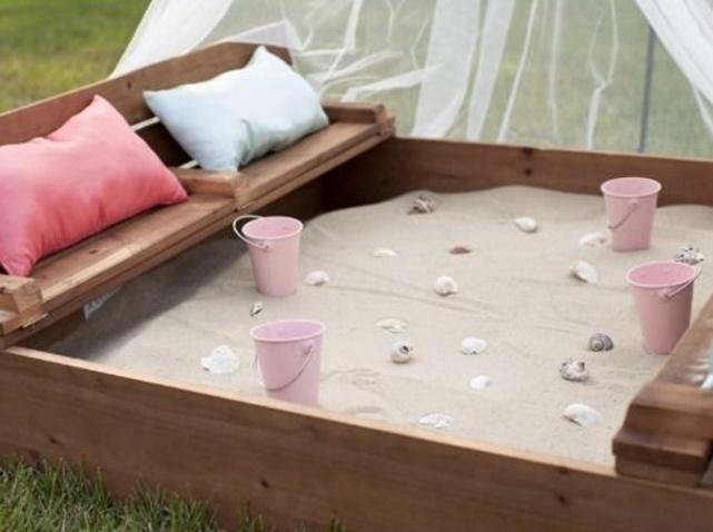 Te proponemos, con la ayuda de unos palets, construir un recipiente grande donde instalarás cuatro asientos -dos a cada lado- a los que dotarás de cojines. El resultado será una zona para sentarse de lo más relajada, donde podrás tomar el sol con tus pies enterrados en la arena o pasar preciosas tardes de primavera leyendo un libro mientras tu hijo/a juega con la arena junto a ti.