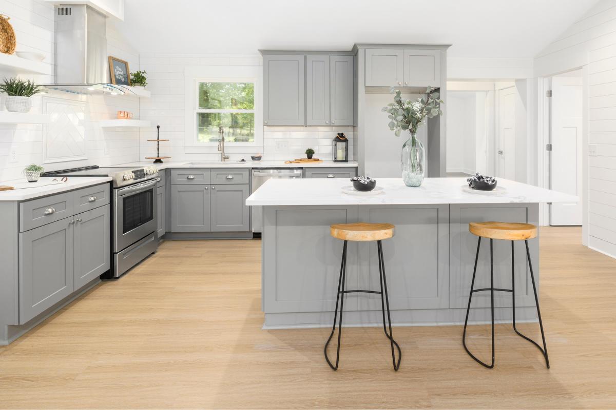 - Isla de cocina en forma de “L” o “U”: si tienes una cocina grande, este tipo de isla es perfecta para ti. Ofrece una gran superficie de trabajo e incluso puede dividirse en diferentes zonas: preparación alimentos, cocción, almacenamiento… También suelen incluir un área para sentarse o una barra de desayuno. Es una opción versátil y cómoda para grandes espacios.