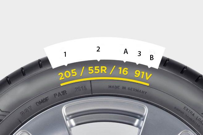 Normalmente, los fabricantes recomiendan que usemos los neumáticos de serie que trae el coche; esta es una opción, pero también podemos elegir cambiar los neumáticos del coche por unos de nuestra elección. En este último caso, tenemos que fijarnos bien en un código que aparece en la parte lateral de las ruedas. Se trata de tres números y dos letras. Si el código fuese 12A3B, éste sería el significado: