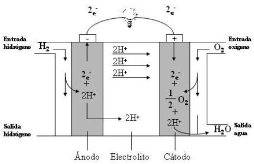 En este sistema la pila consume una serie de reactivos que se reabastecen constantemente. Al mezclarse el hidrógeno entrante —los ánodos, de energía positiva— con el oxígeno entrante —los cátodos, de energía negativa— se efectúa un intercambio de protones sobre una membrana, mientras que los electrones que se pierden se dirigen a las baterías y desde allí, al motor. Por otro lado, este procedimiento desprende nitrógeno por el conducto del hidrógeno y vapor de agua por el de oxígeno, pero no dióxido de carbono ni otros gases contaminantes.