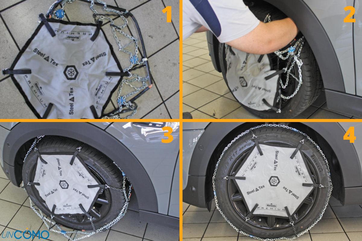 En la práctica, no son cadenas sino fundas de nailon. En primer lugar, desenrolla las cadenas para asegurarte que las colocas en el sentido correcto.