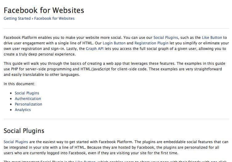 Ir a la sección para desarrolladores de Facebook y hacer click en el botón central "add Facebook to my website"