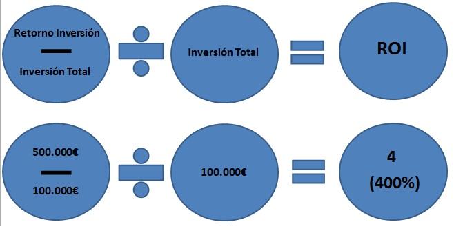 Ahora es el momento de establecer la ecuación. ROI = (500.000€ - 100.000€) dividido en 100.000 €, multiplicado por 100.