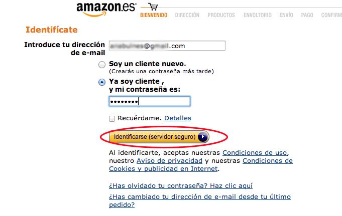 Si no habías iniciado sesión en Amazon, tendrás que hacerlo ahora. Sigue las instrucciones según sea tu caso: introduciendo email y contraseña si ya tenías cuenta o introduciendo los datos que te pide si no estás registrado.