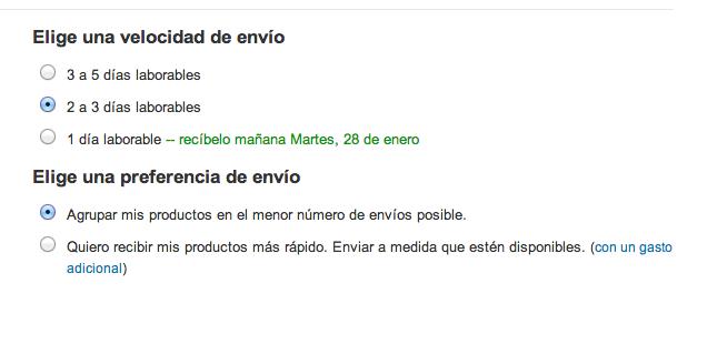 Escoge la modalidad de envío que quieres: cuántos días quieres que tarde en llegar y si quieres que agrupen los productos en un paquete o que los vayan enviando cuando estén disponibles. Haz click en "Continuar".