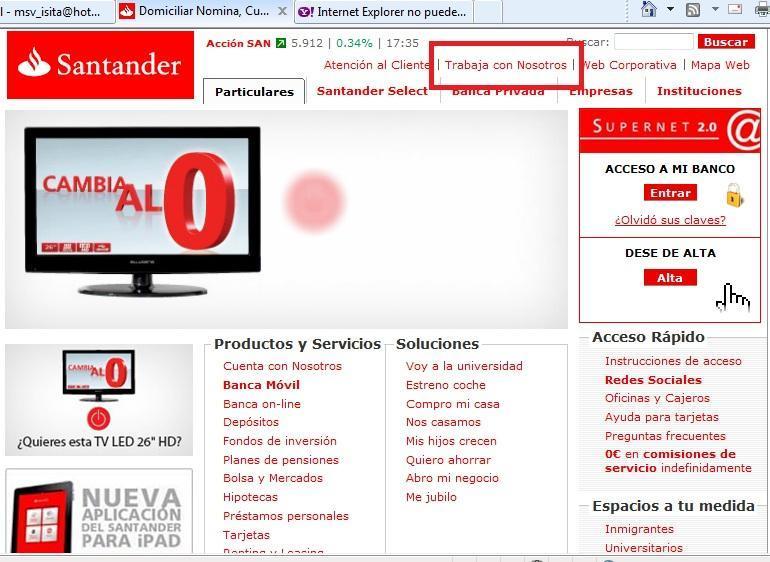 En la parte superior de la web del Banco Santander, encontrarás una serie de enlaces. Busca Trabaja con nosotros y clica.