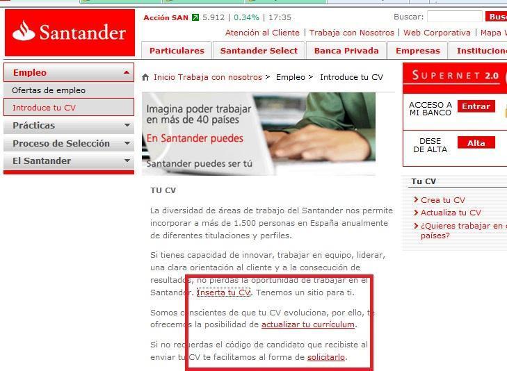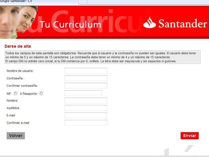 Para introducir tu currículum y optar a las ofertas de trabajo de que dispone el Santander, deberás estar registrado, rellenando los campos que te piden en el siguiente formulario. Recibirás un email de confirmación y el último paso sería rellenar tu información personal, laboral, académica...