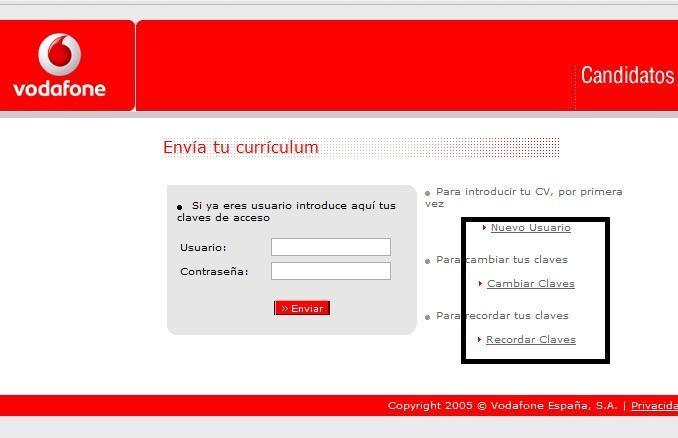 Finalmente, para acceder a los procesos de selección para conseguir empleo en Vodafone, deberás introducir tu CV previo registro en su base de datos. Desde esta pantalla también podrás modificar y recordar tus claves.