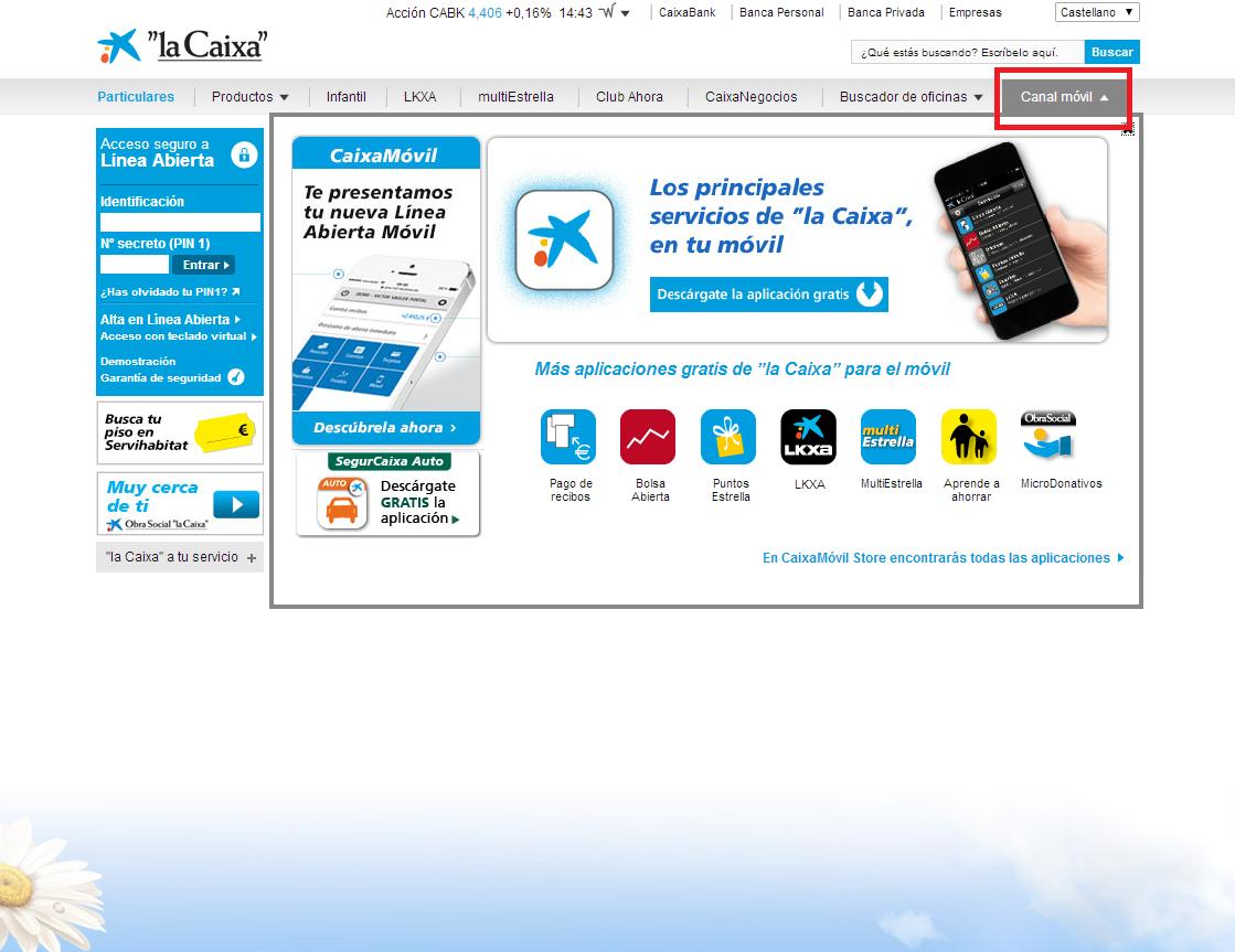 Haz clic en la opción "Canal móvil" del menú que encontrarás en la barra superior y, una vez se haya desplegado, presiona sobre "Descárgate la aplicación gratis" que te permitirá instalar la app en tu smartphone. O, si lo prefieres, dirígete directamente a la CaixaMóvil Store.