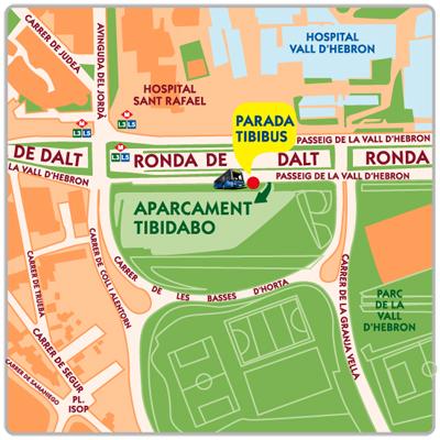 Para llegar al Tibidabo en metro tendrás que coger la L5 (línea azul) o la L3 (línea verde) y bajarte en la parada del Vall d'Hebrón. Allí, en el aparcamiento que te muestra el mapa adjuntado, hay un autobús lanzadera gratuito para aquellos que tengan las entradas que te dejará en la puerta del Tibidabo. Si no tienes las entradas las puedes comprar en la taquilla que hay en el mismo aparcamiento.
