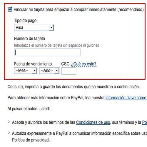 Este es el paso más importante. PayPal te ofrece vincular tus datos bancarios con tu nueva cuenta para poder comenzar a utilizarla de manera inmediata. Los datos que te piden son los siguientes: Tipo de tarjeta con la que vas a realizar los pagos (Visa,...), el número de ésta y su vencimiento, así como los tres números que aparecen por detrás para ofrecer mayor seguridad.