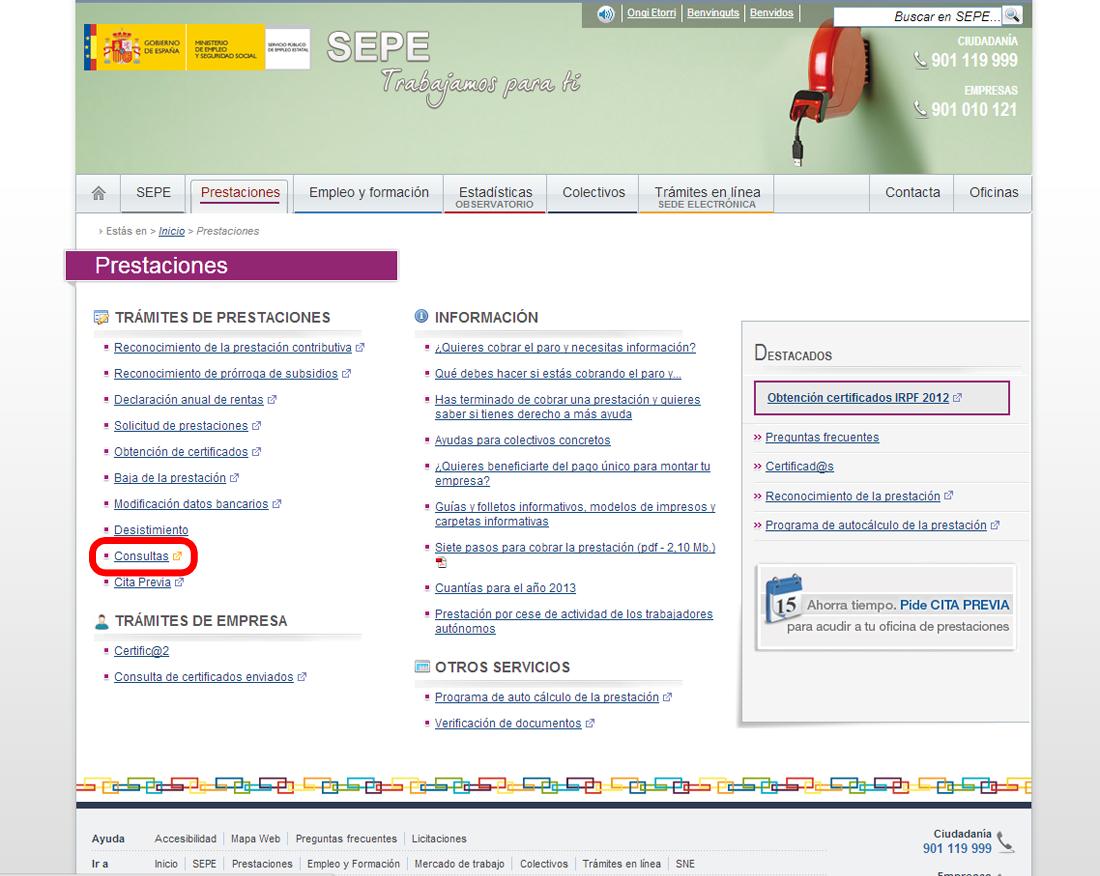 A continuación, deberás hacer click en el apartado "Consultas" para poder acceder a la información relativa a tu prestación de desempleo.