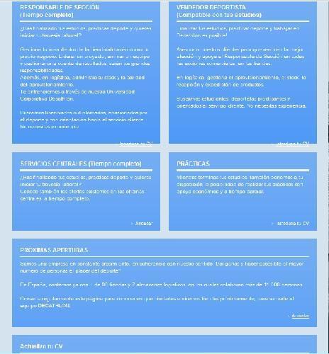 El nuevo enlace que se abre, te permite visualizar las ofertas de Decathlon agrupada por temáticas: responsable de sección, vendedor deportista, servicios centrales, prácticas y próximas aperturas. Clica sobre la oferta de empleo que más te interese.