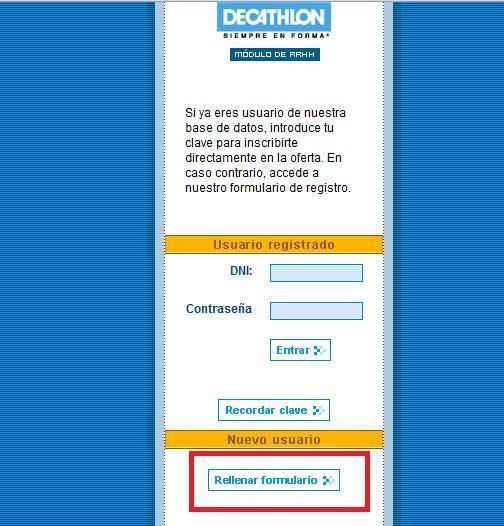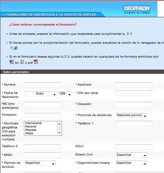 Finalmente, el enlace anterior te llevará a este formulario que deberás cumplimentar para acceder a las ofertas de empleo en Decathlon.