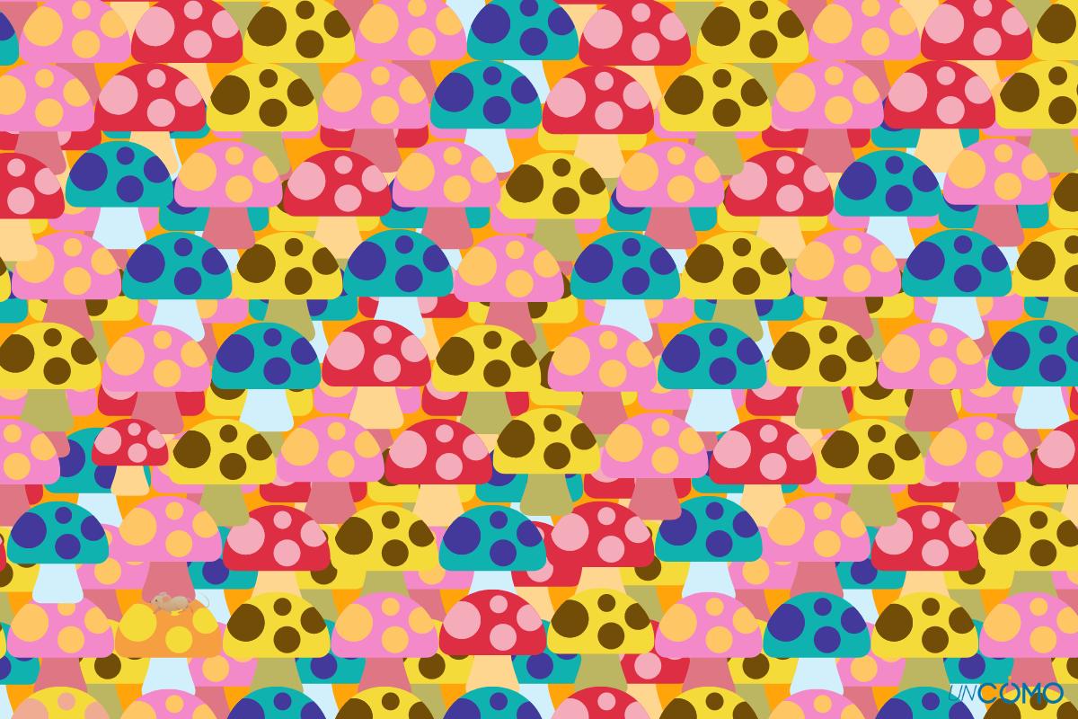En la imagen siguiente hay una gran cantidad de setas de diferentes colores. Entre ellas, se encuentra un ratón escondido. ¿Puedes encontrarlo?