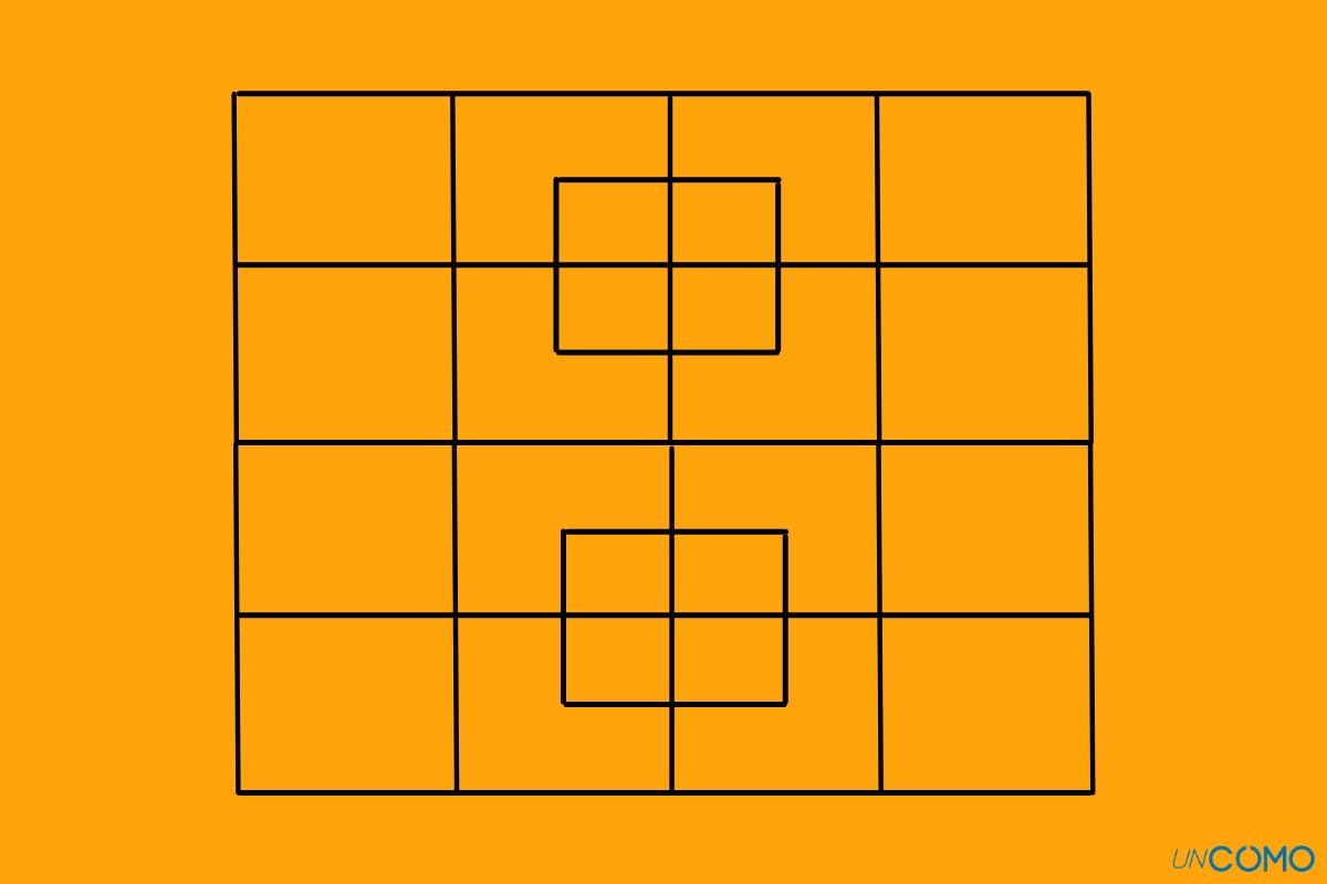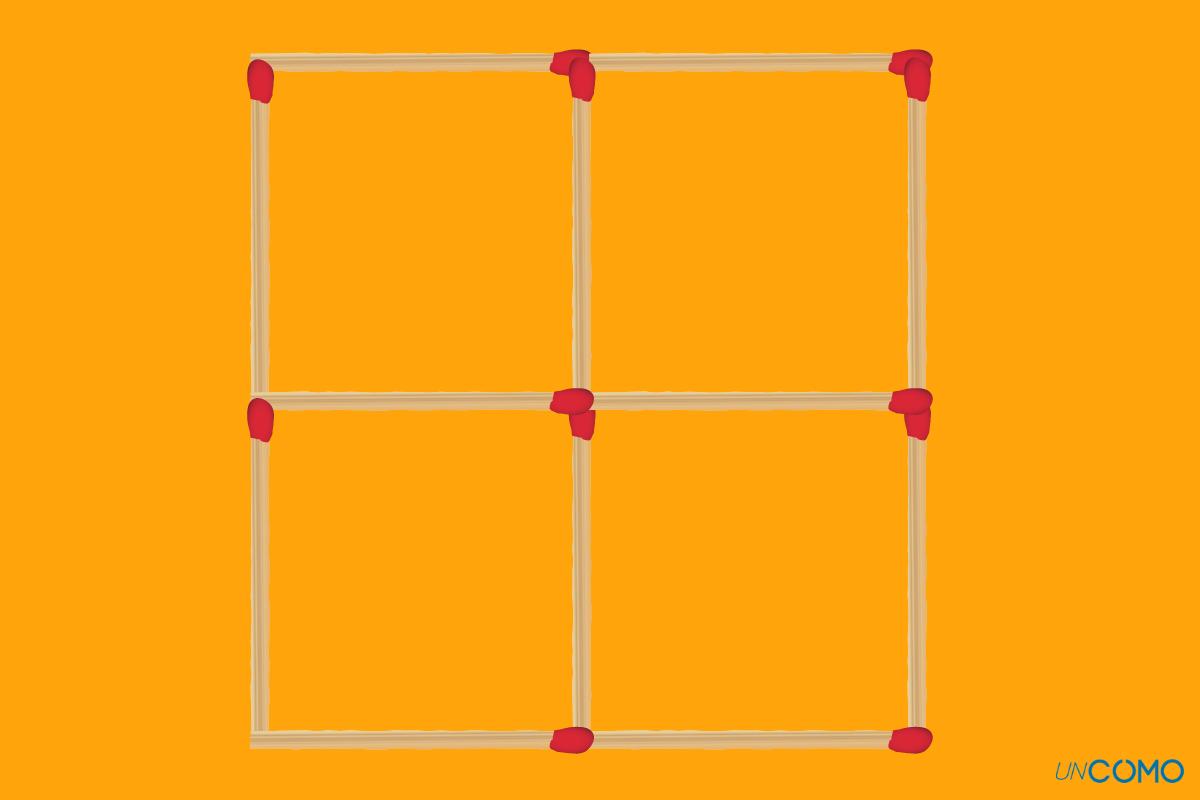 Coge unas cuantas cerillas o palillos y crea una cuadrícula formada por 4 cuadrados idénticos, tal y como quedan ilustrados en la siguiente imagen. También puedes crear la cuadrícula con papel, un lápiz y una goma de borrar.