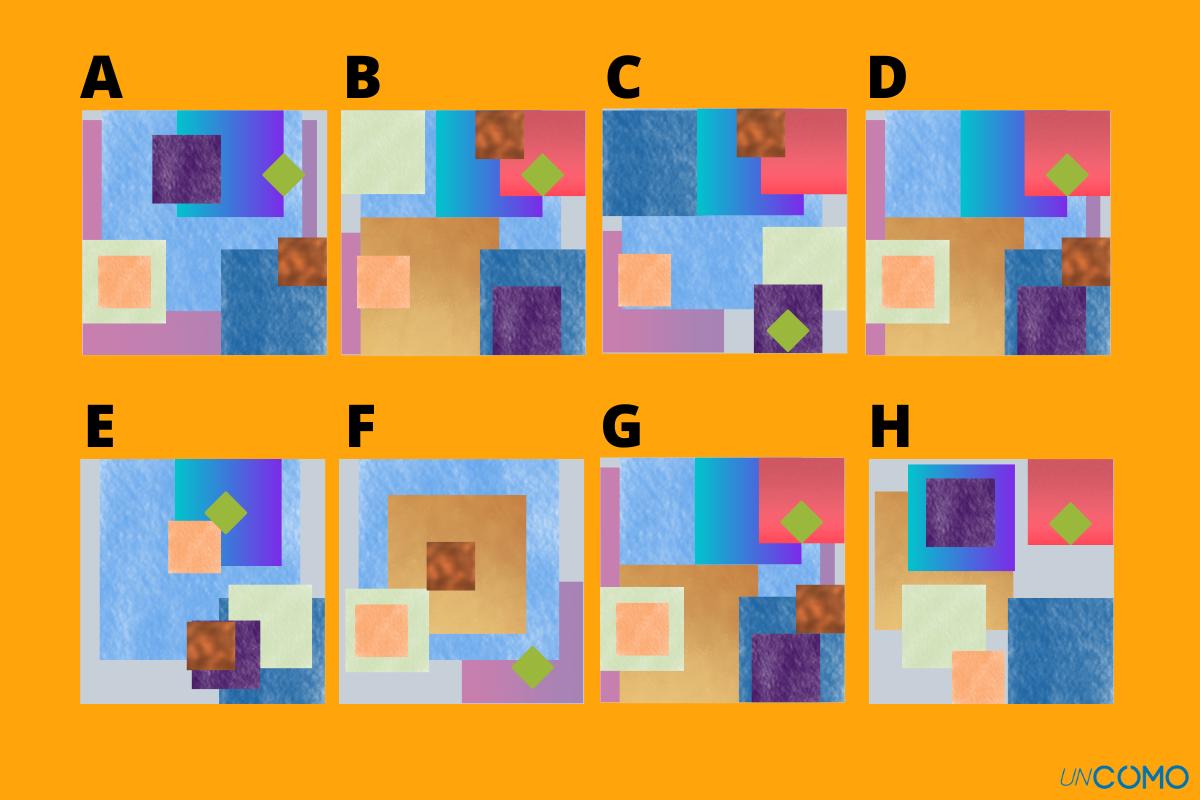 Varias imágenes de cuadrados de distintos colores. Dos de las imágenes son iguales. pero son difíciles de encontrar. ¿Las has visto?