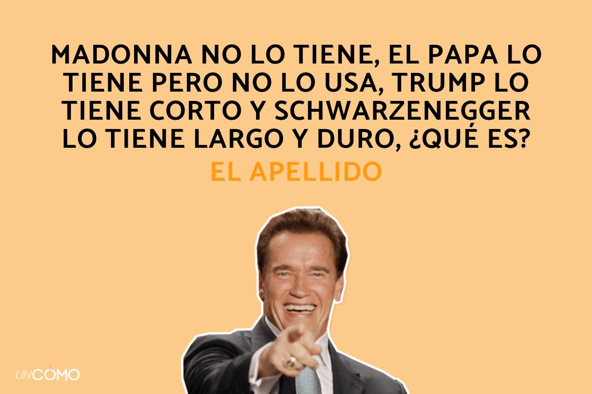 - Madonna no lo tiene, el Papa lo tiene pero no lo usa, Trump lo tiene corto y Schwartzenegger lo tiene largo y duro, ¿qué es? El apellido.