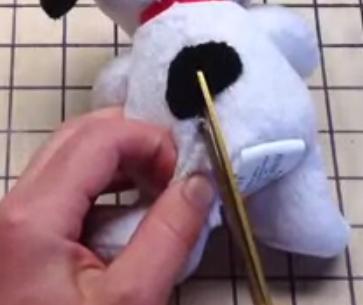 El siguiente paso es buscar una buena zona donde cortar y abrir el juguete para acceder al altavoz y batería. Es importante hacerlos desde atrás o desde una zona que después podamos coser comodamente y no moleste a nuestro hijo.