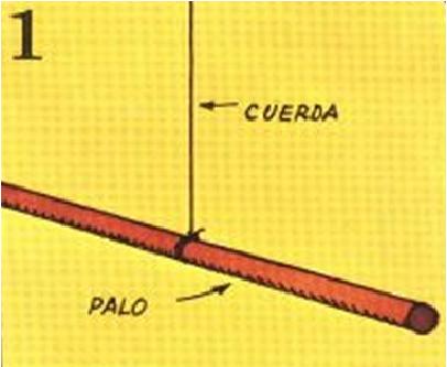 Primero anuda fuertemente el extremo de una cuerda en el centro del palo. Por el otro extremo levanta el palo. Desliza la cuerda a lo largo del palo hasta que quede perfectamente nivelado.